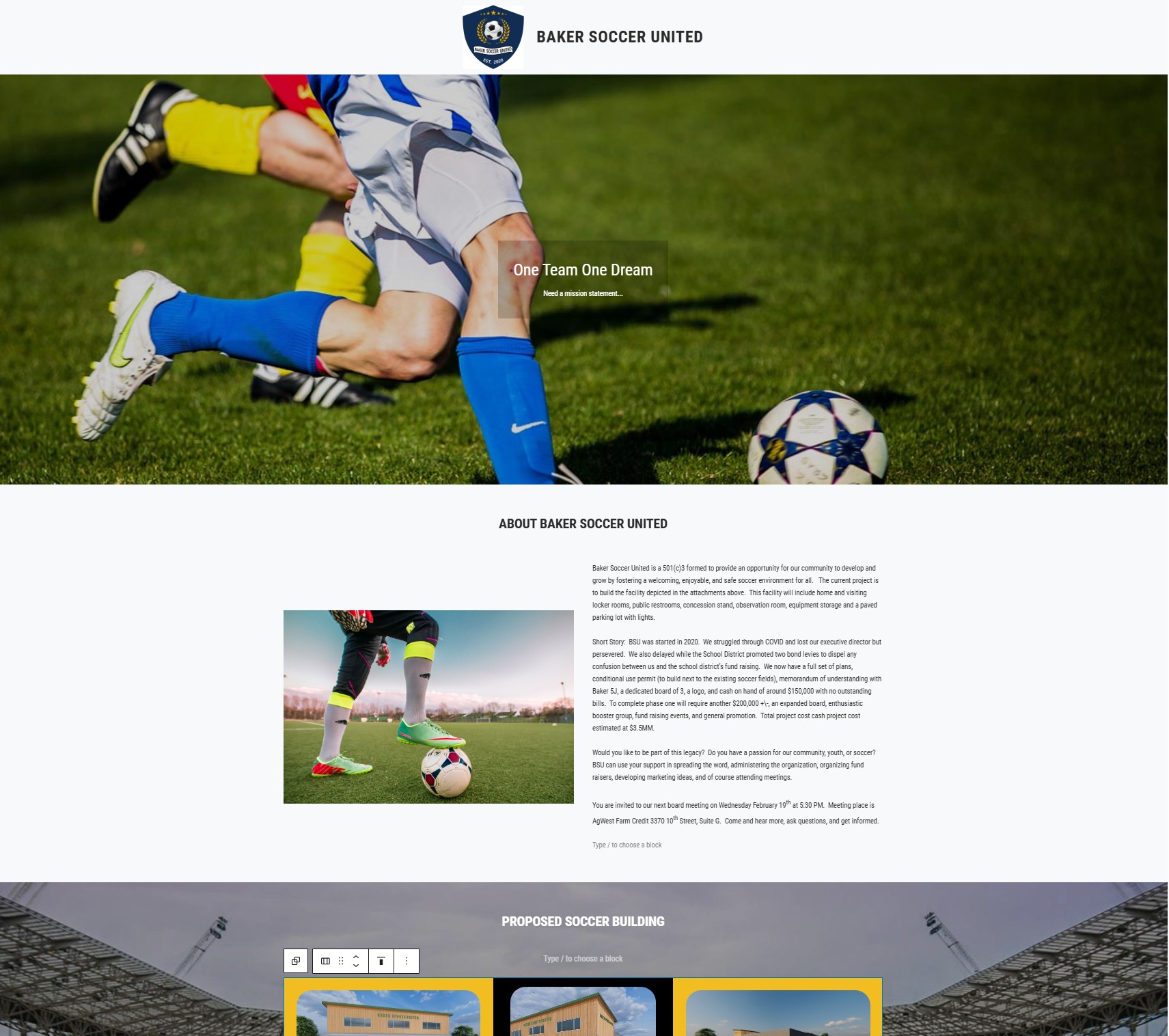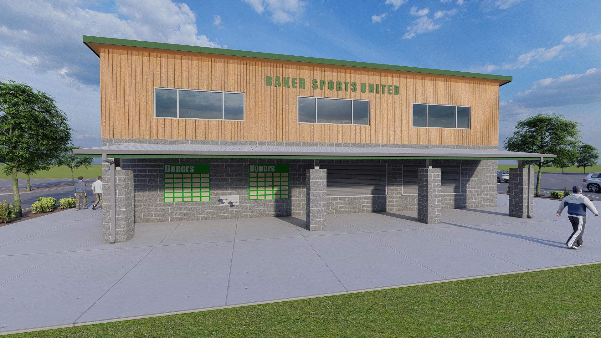 Baker Soccer United is a 501(c)3 formed to provide an opportunity for our community to develop and grow by fostering a welcoming, enjoyable, and safe soccer environment for all. The current project is to build the facility depicted in the attachments above. This facility will include home and visiting locker rooms, public restrooms, concession stand, observation room, equipment storage and a paved parking lot with lights.